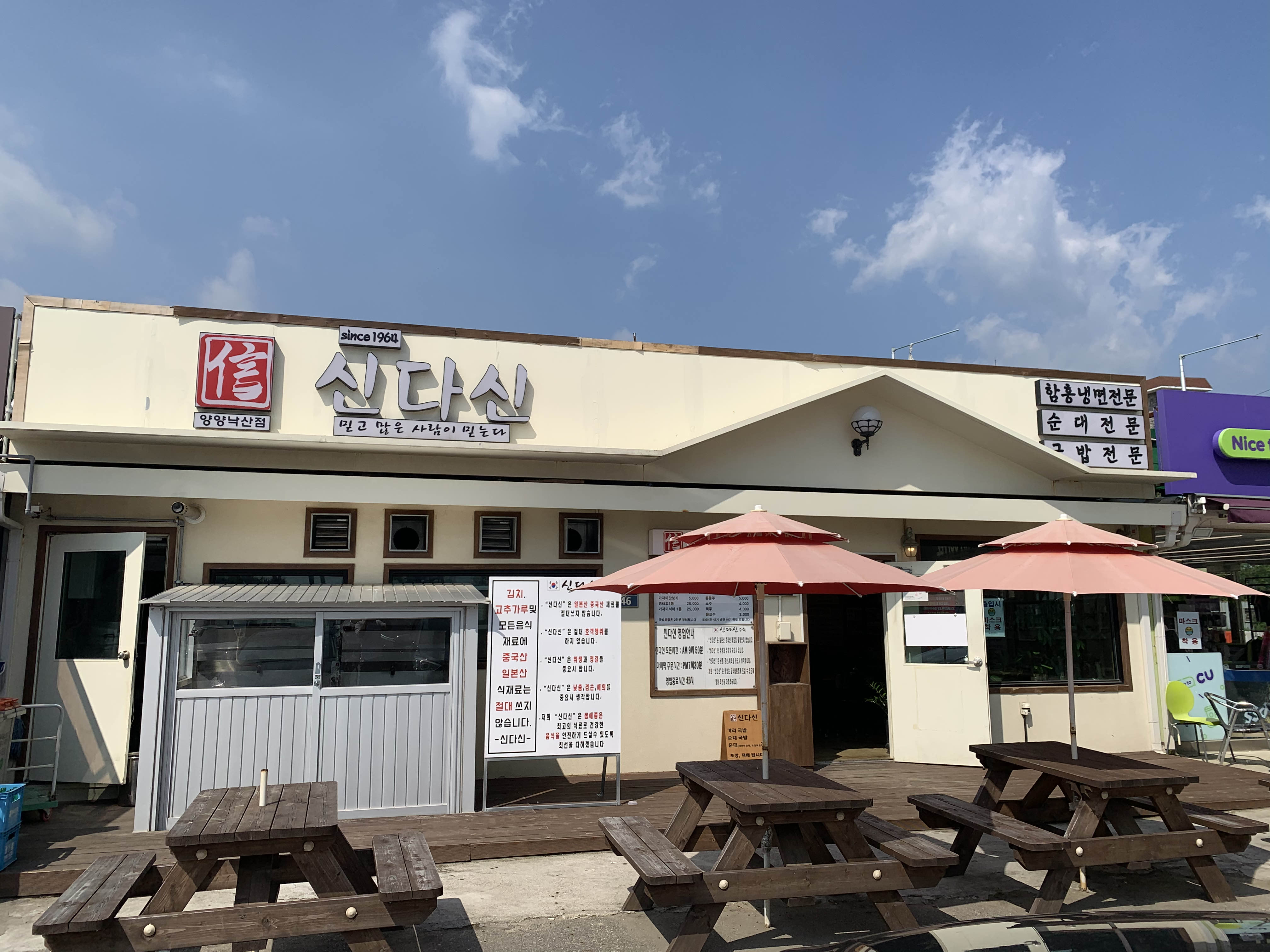 이번 주말에 날씨가 느므느므 좋아 양양 쏠비치 쪽으로 가족들과 여행을 다녀왔지요. 조식을 리조트에서 해결할까 하다 늦잠을 자는 바람에 가까운 곳으로 순대국밥 한그릇 하기 위해 나왔어요.ㅎ