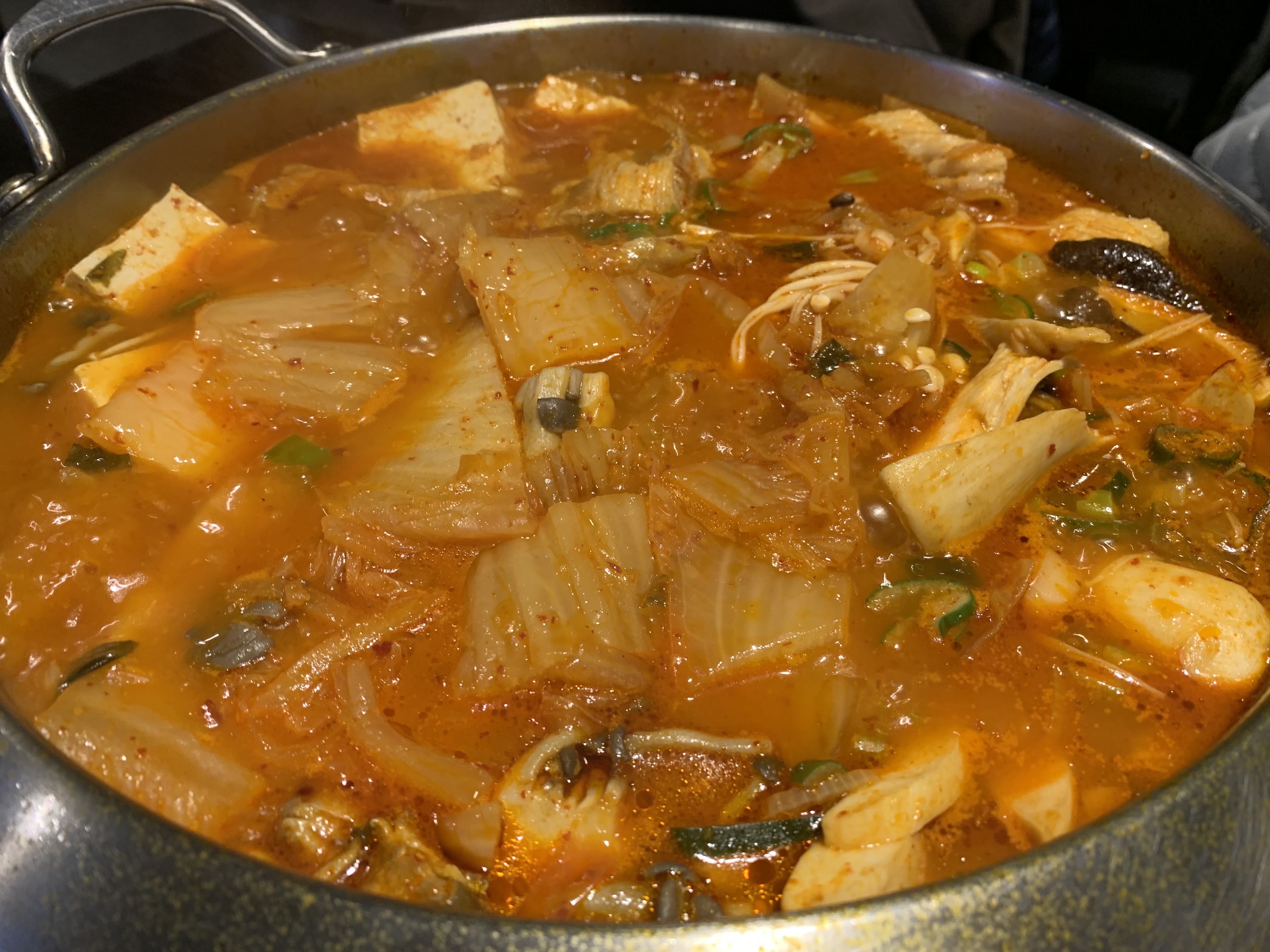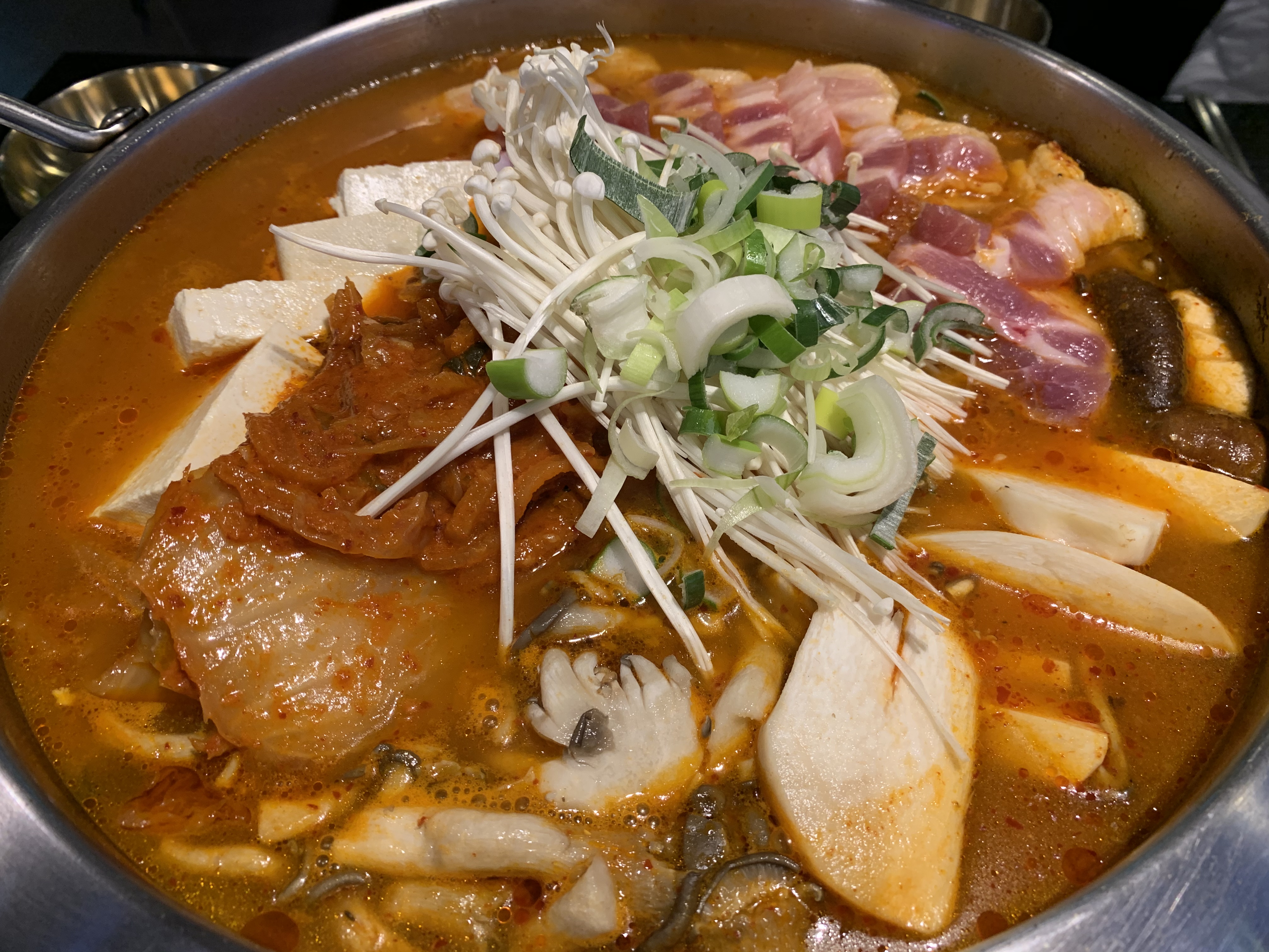 전골은 삼겹살과 묵은지에 육수를 부어 바로 끓여 먹을 수 있게 나옵니다. 10분정도 푹 끓여 고기육수가 베이도록 익혀주면 이게 바로 꿀맛이죠! 푹 끓인 후 묵은지는 먹기 좋게 가위로 잘라 주심 되고요.