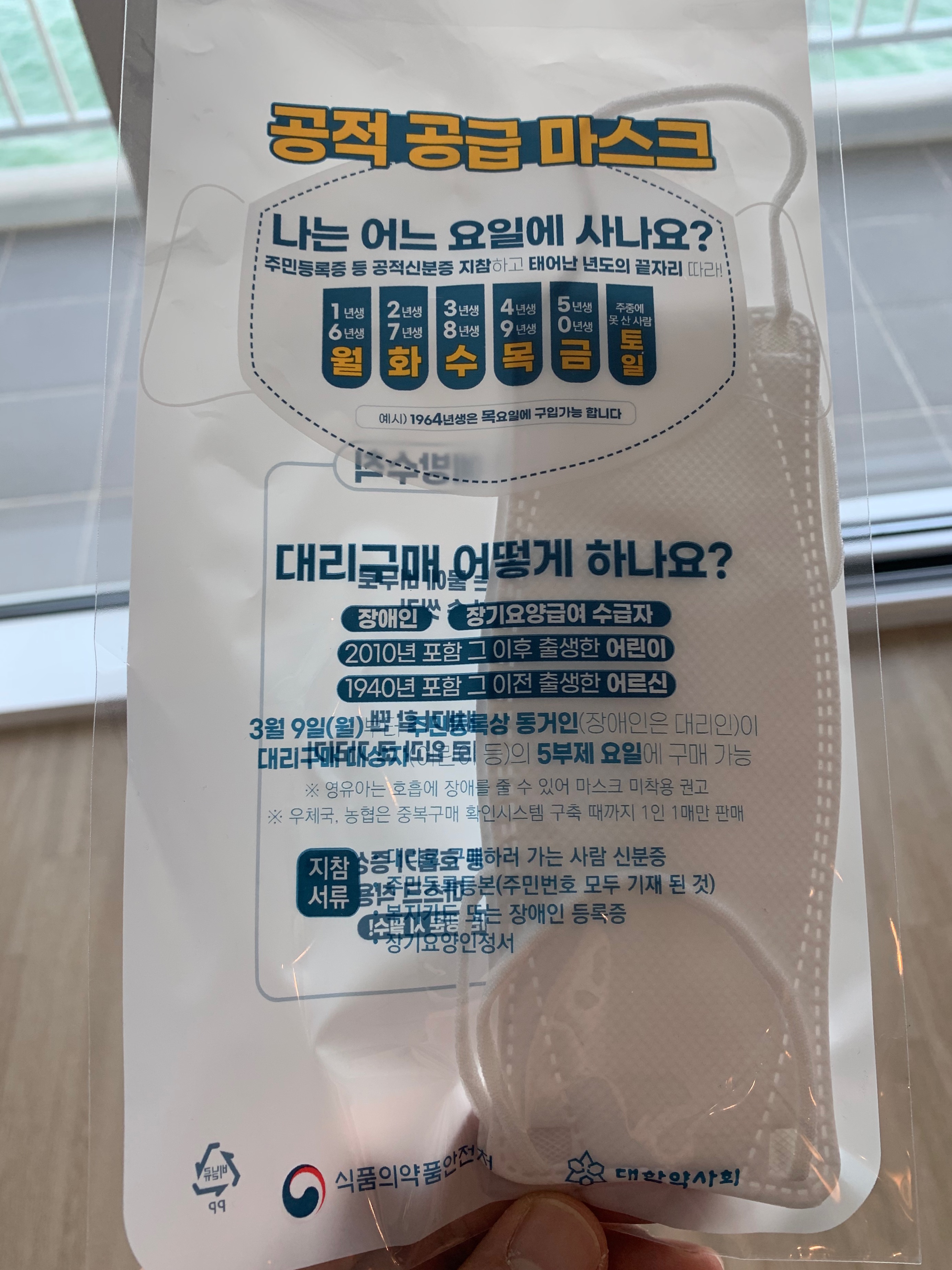 금일부터 약국에서 공적 마스크를 살 때 한 사람이 1주일에 2장만 사도록 제한을 두고 중복 구매를 막기 위해 차주(3월 9일)부터는 5부제가 시행된다고 합니다. 이에 따라 오늘부터 약국에서 공적 마스크를 사려면 주민등록증 등 공인신분증을 가져가야 합니다. 한 사람이 일주일에 한 번씩, 두 장까지만 살 수 있고, 대리 구매는 원칙적으로 불가 합니다. 이는 하루 천만 장 수준으로 생산을 늘려도 마스크 부족이 발생하니 구매량을 제한하는 방법업니다.