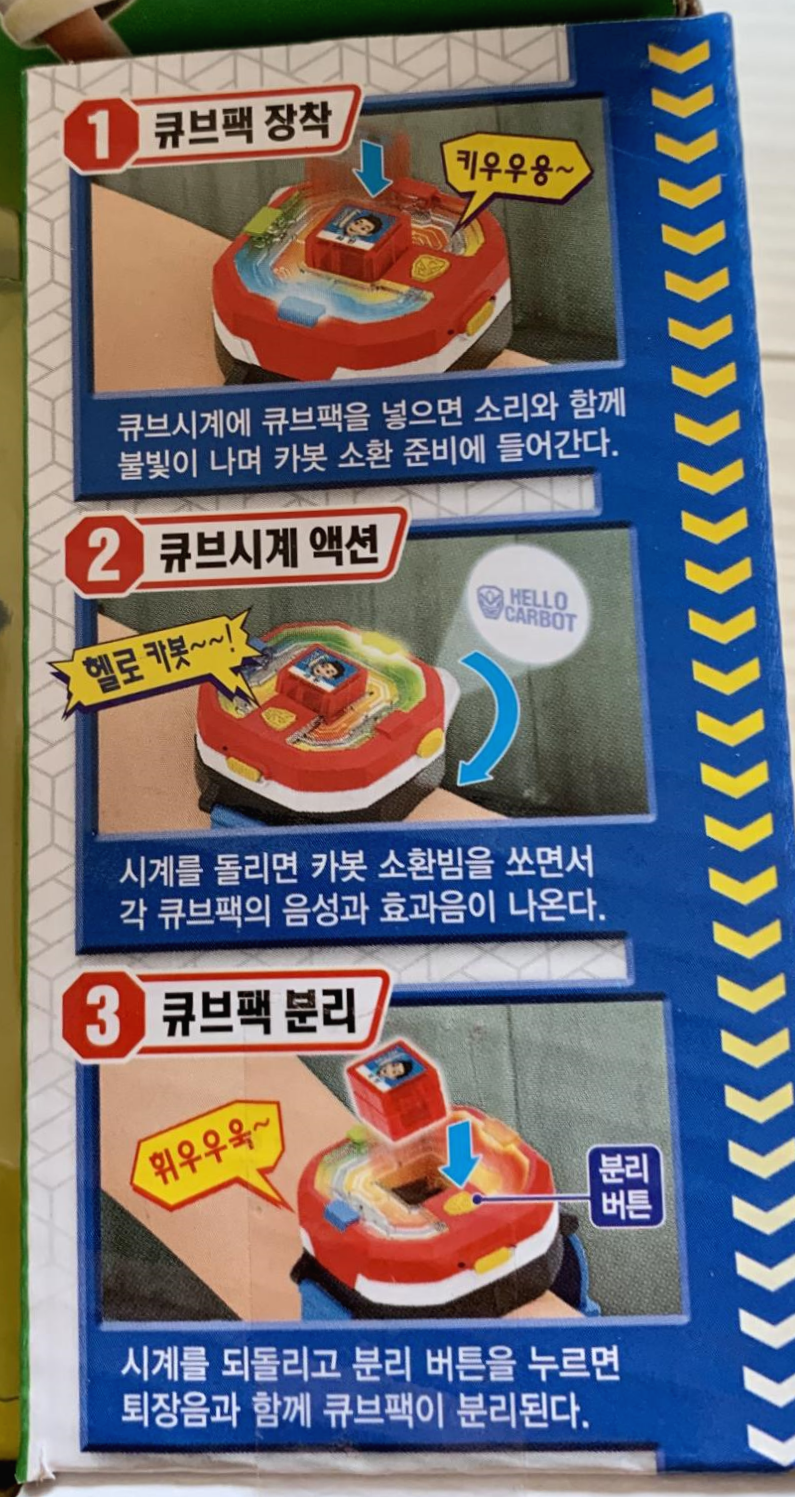 구성품은 헬로카봇 시계 와 큐브팩 1개 그리고 사용설명서가 동봉되어 있습니다. 건전지는 포함되어 있지 않으니 개봉하기 전에 'AAA' 건전지 1개를 미리 준비하셔야 아이들의 원성을 듣지 않으실 거에요. ㅋ