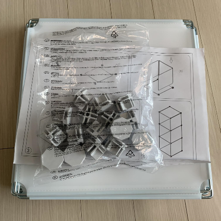 박스를 개봉해 보니 이케아 제품들에서 보이는 심플한 설명서와 선반 13개와 8각형 모양의 조인트 부품(커넥터) 16개가 동봉되어 있습니다. 조립시 주의해야 할 점은 선반이 철제의 프레임에 원단형태를 하얀부분을 봉제한 것이라 봉제 부분이 매끄러운 부분과 튀어나온 부분이 있으니 적절하게 선택하셔서 조립하시면 됩니다.