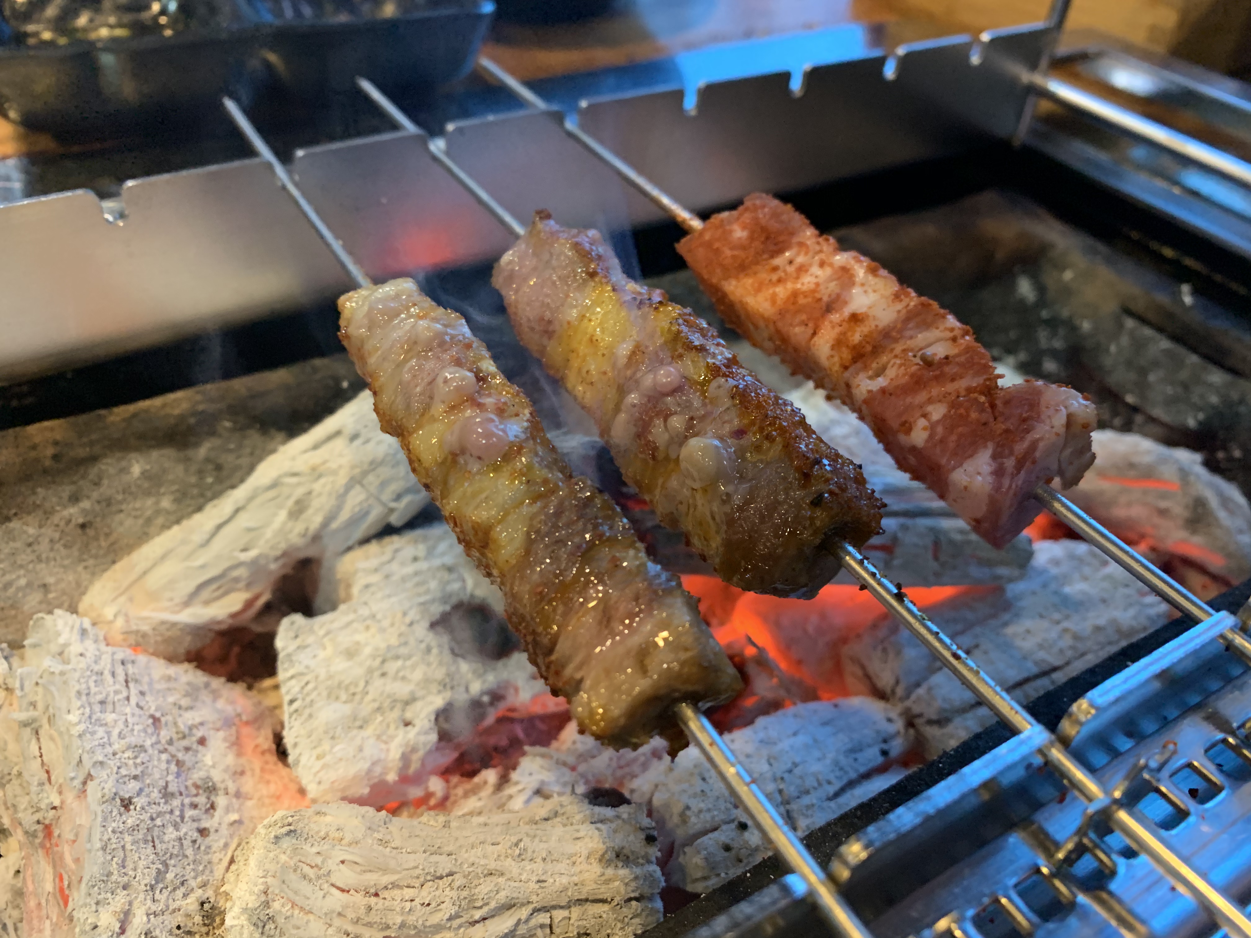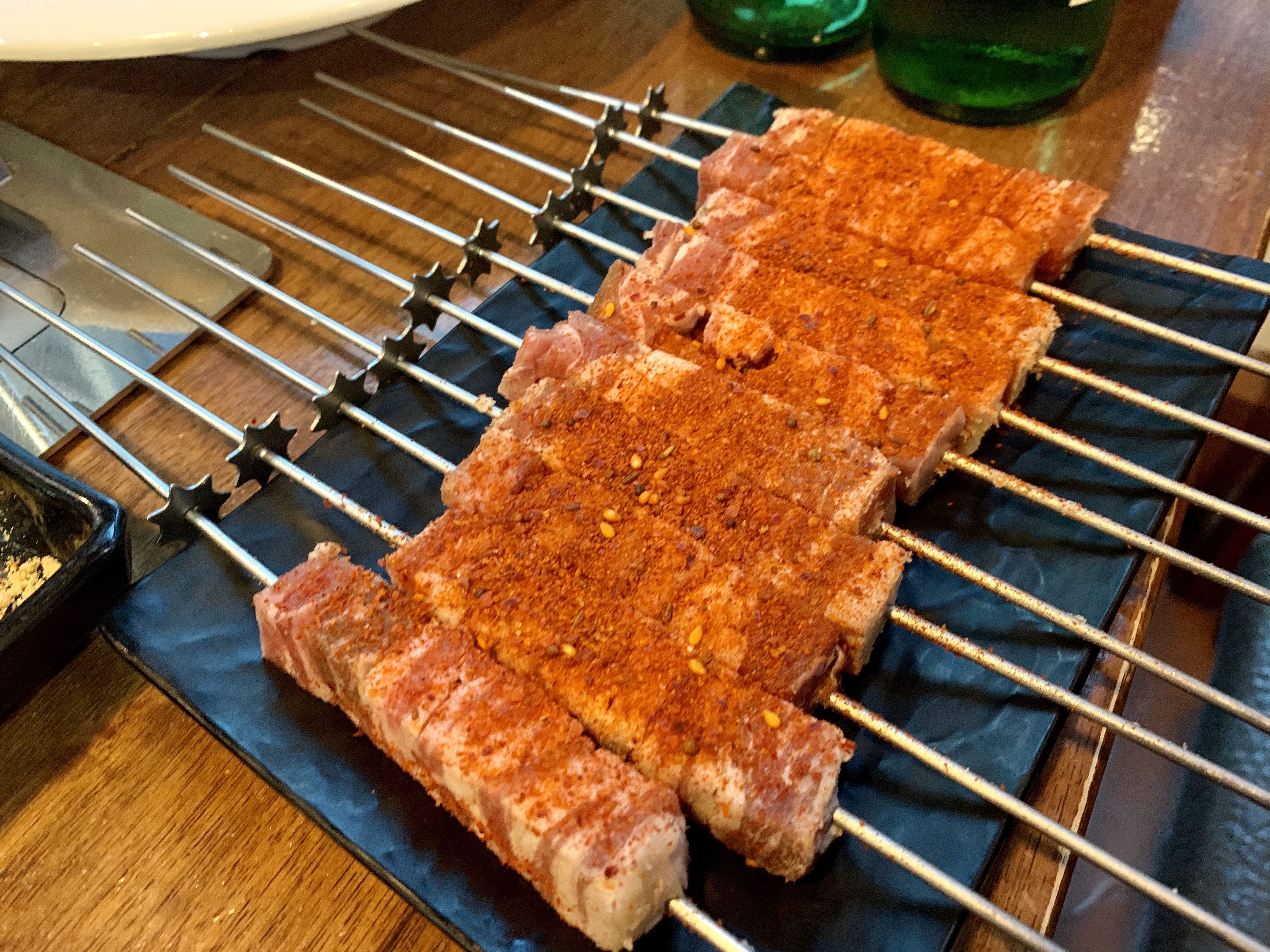 세트로 주문한 고기가 부족한 감이 없지 않아 추가로 더램 시그니쳐 메뉴인 '양꼬치'를 추가로 주문했습니다. 역시 양꼬치는 꼬치에 끼워진 양고기를 한 두개 씩 올려서 구워먹는 재미가 있지요. 술안주로 딱입니다!! 호불호가 갈리는 쯔란 소스가 듬뿍 뿌려져 있네요. 쯔란이 처음 먹을때 조금 이상하지만 계속 먹다보면 중독이 되어버립니다. ㅎㅎ 양고기 뿐만 아니라 소고기 스테이크에 찍어 먹어도 정말 잘 어울린 답니다. ㅎㅎ