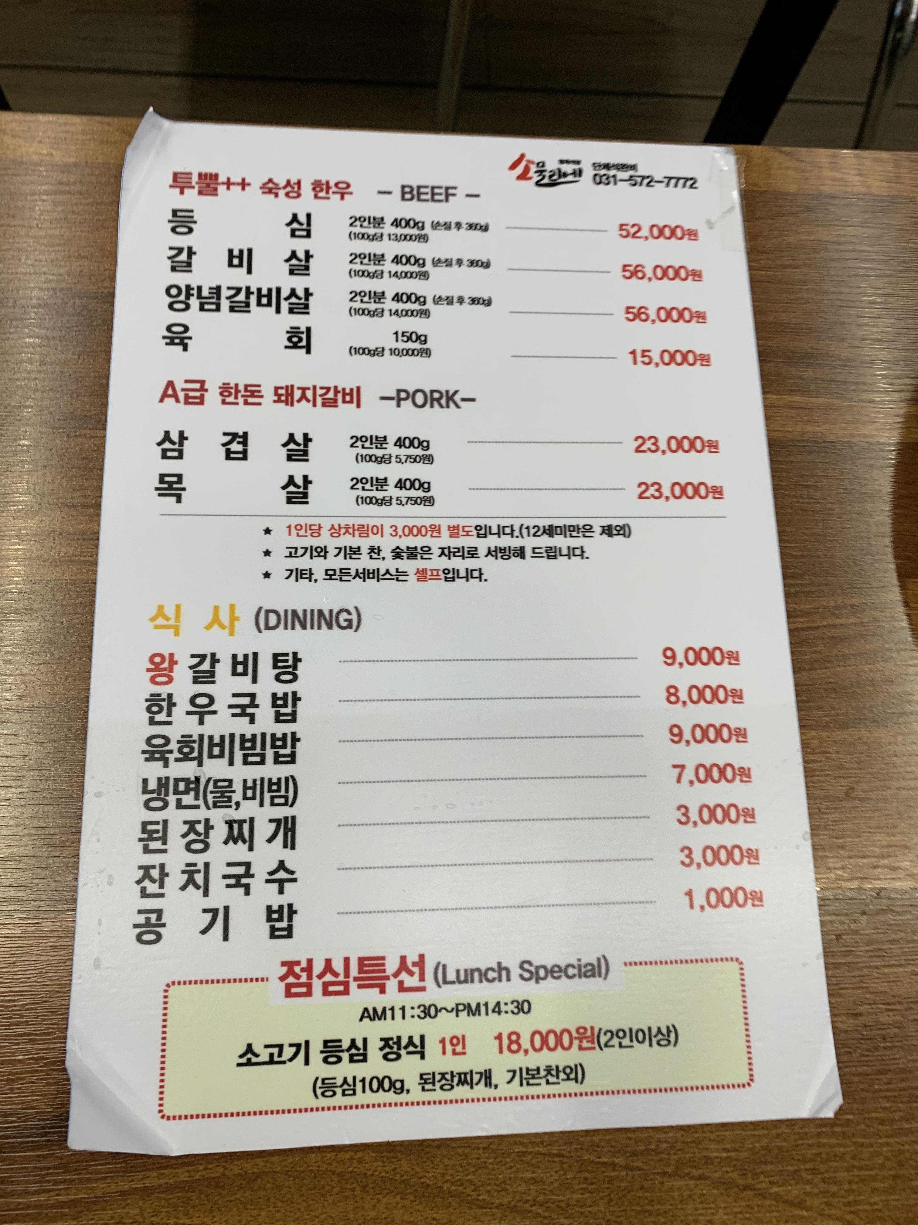 기다리는 동안 땀도 좀 뺐겠다 아이들이 좋아하는 등심으로 주문을 합니다. 가격이 조금 올랐습니다. 투뿔 숙성한우 400g에 52,000원이라니 그래도 가격이 정말 착합니다. (지금은 가격이 더 올랐음)