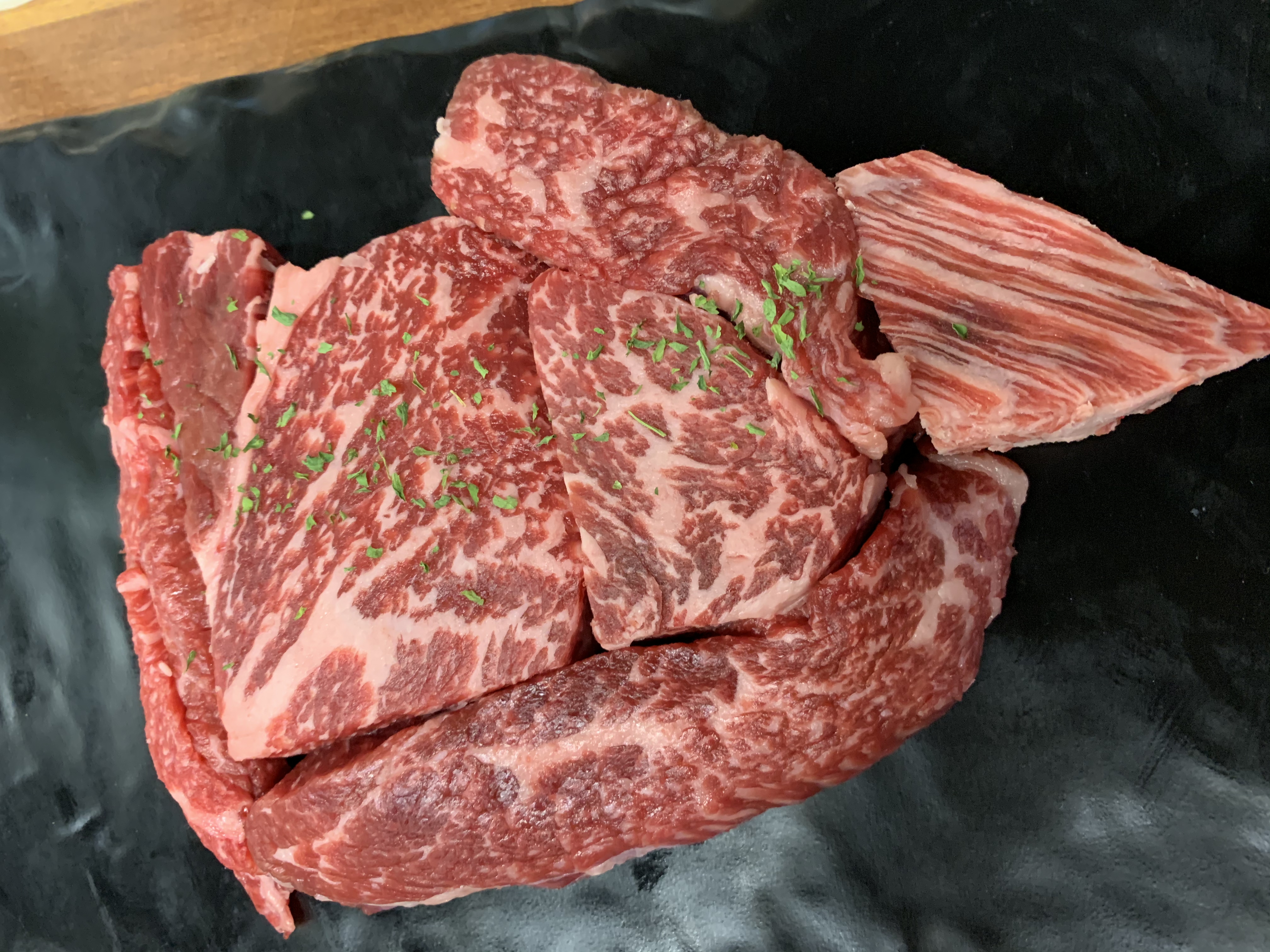 숙성된 한우 빛깔이 선홍빛으로 적절하게 마블링이 섞여 있는 좋은 고기네요. 전체적으로 덩어리채 앞뒤로 바싹 구워주고 깍둑썰기로 잘라서 한번더 익혀주면 끝!
