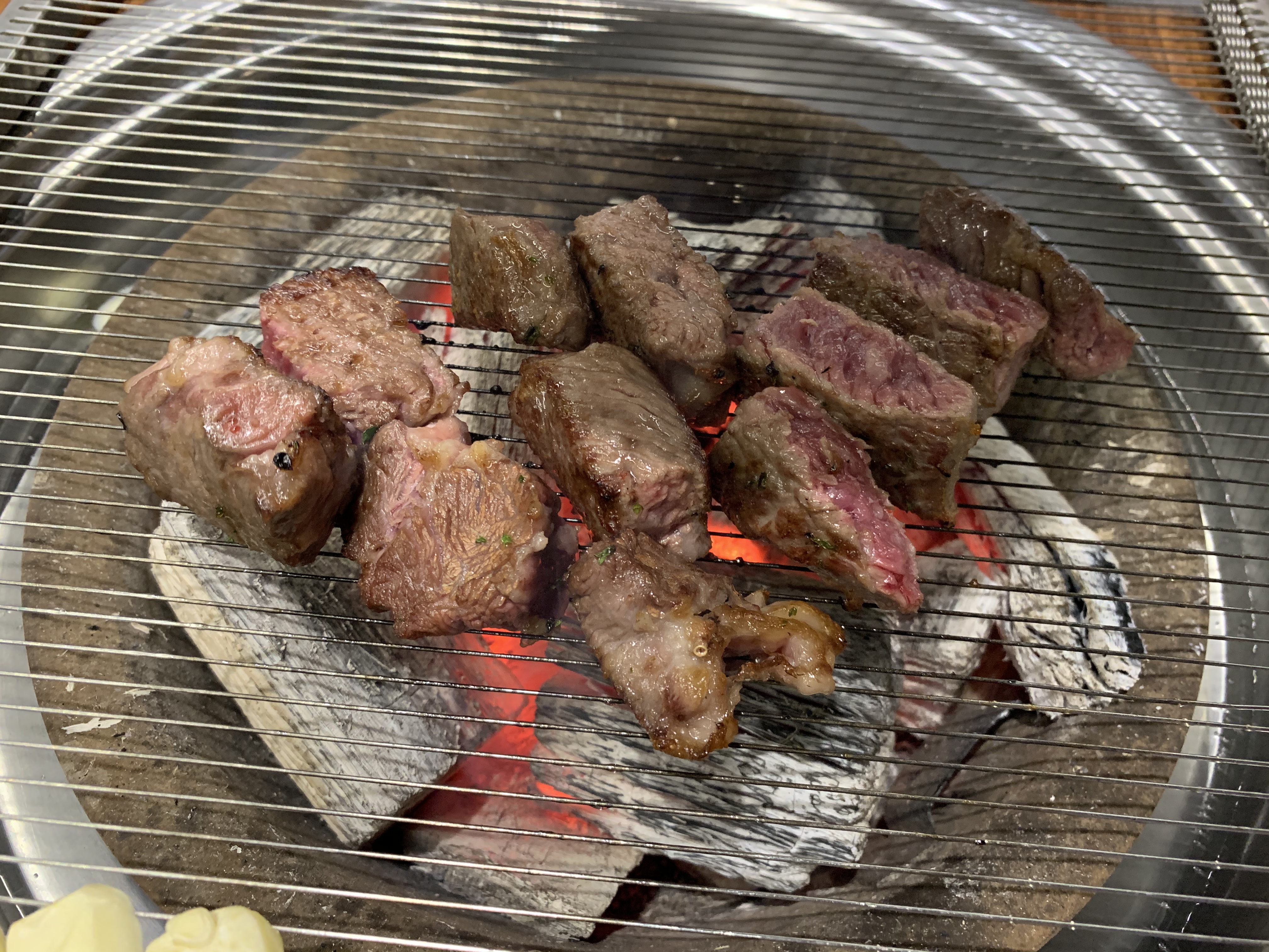 고기는 역시 두꺼워야 맛이 있습니다. 고기가 두꺼워 노릇 노릇 깍두기 썰듯 잘라 구워주면 겉은 바싹하고 씹을때 육즙이 터지면서 숙성한우의 진짜 맛을 느낄수 있습니다. 기름이 떨어지면서 올라오는 연기로 훈연이 되면서 후라이팬에서 구운 고기에서 느낄수 없는 불향이 입혀지게 되는거죠.