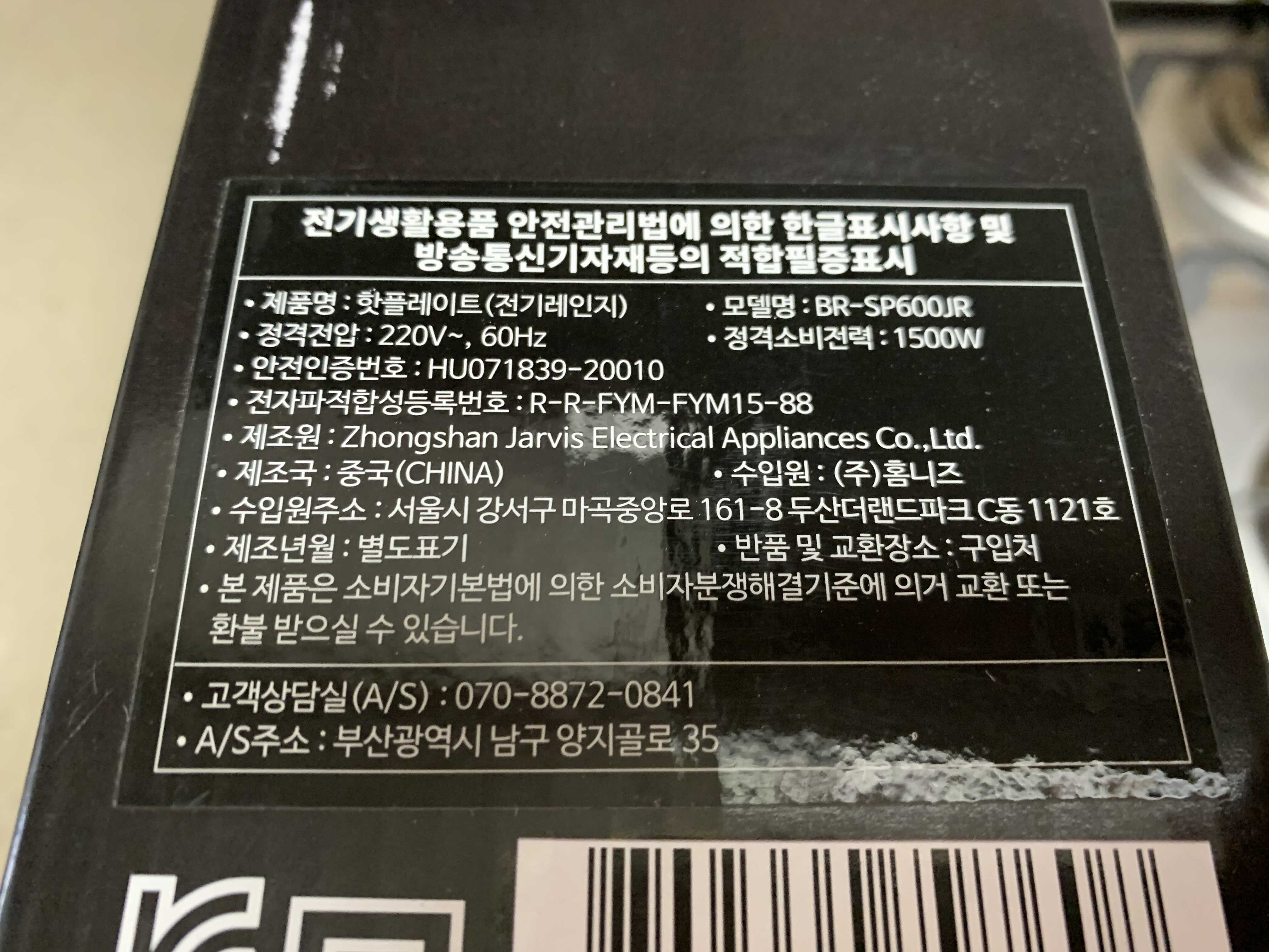 박스 뒤쪽으로 전기용품 안전관리 인증관련 스티커 부차되어 있습니다. 이런 전기제품은 안정인증이 확실해야 화재에 대한 위험성도 낮아지니 선택시 필수 요소로 확인하셔야 합니다. 소비전력이 1,500W 군요 무지하게 쎄네요. 캠핑장에서 사용하면 전기 다 떨어지겠네요 ㅎㅎ