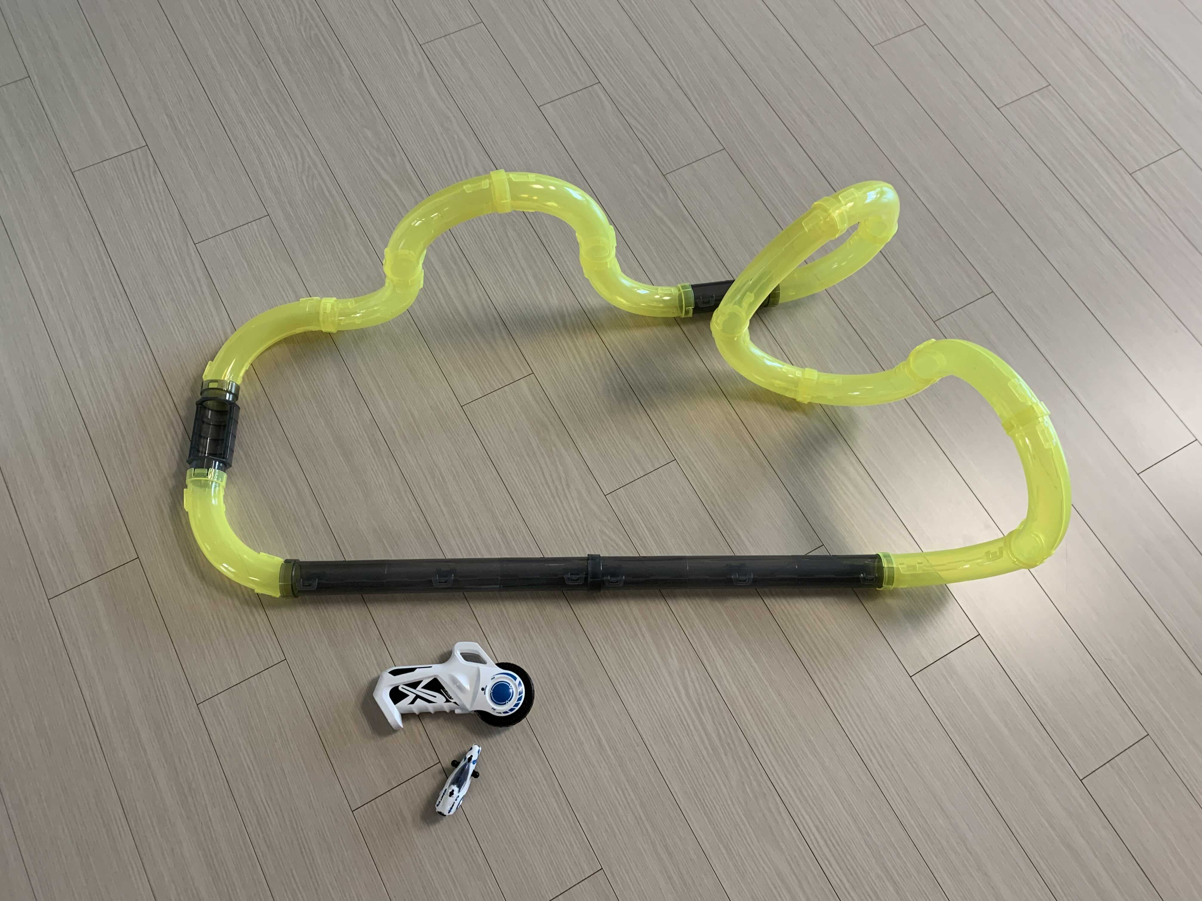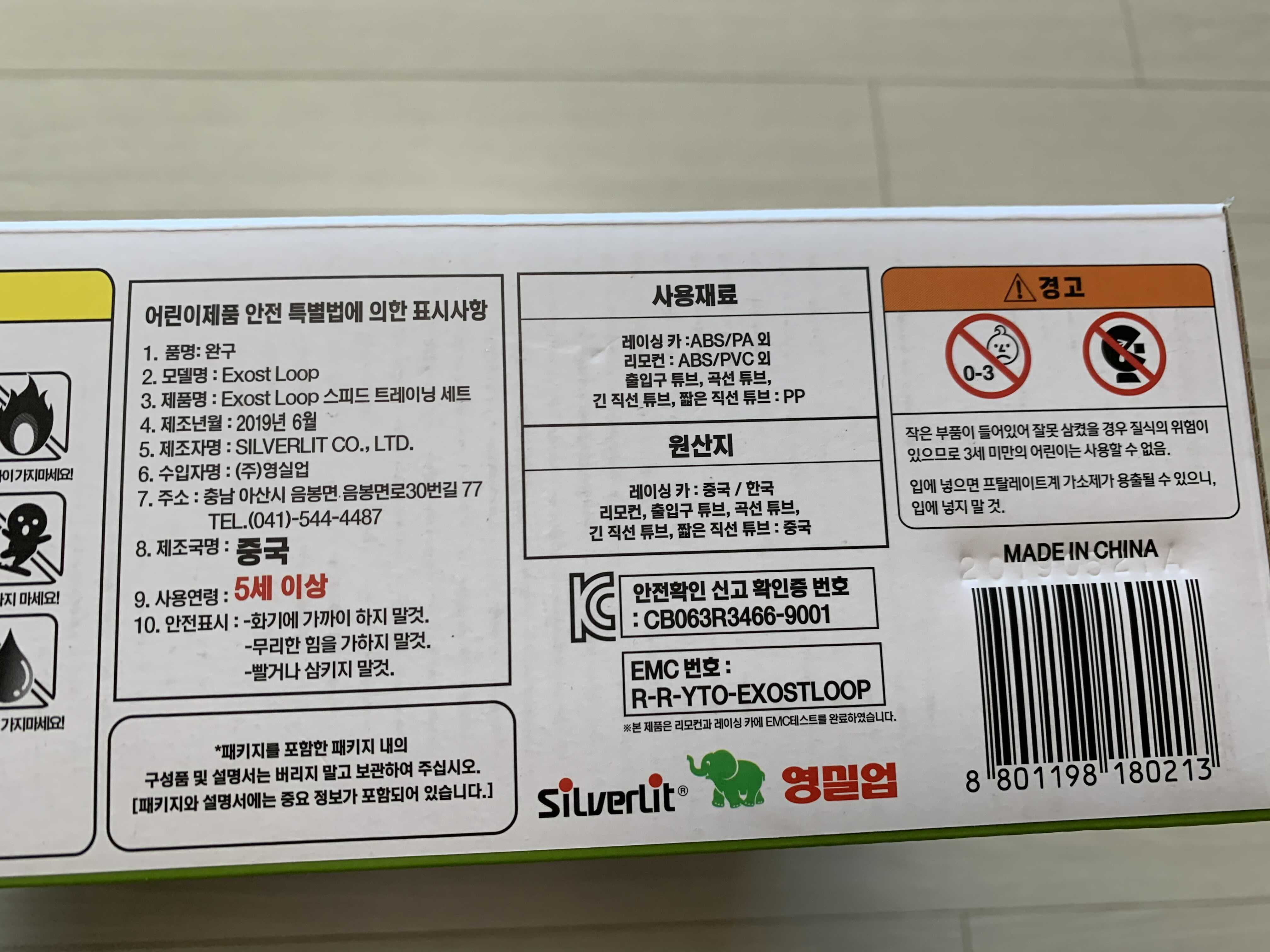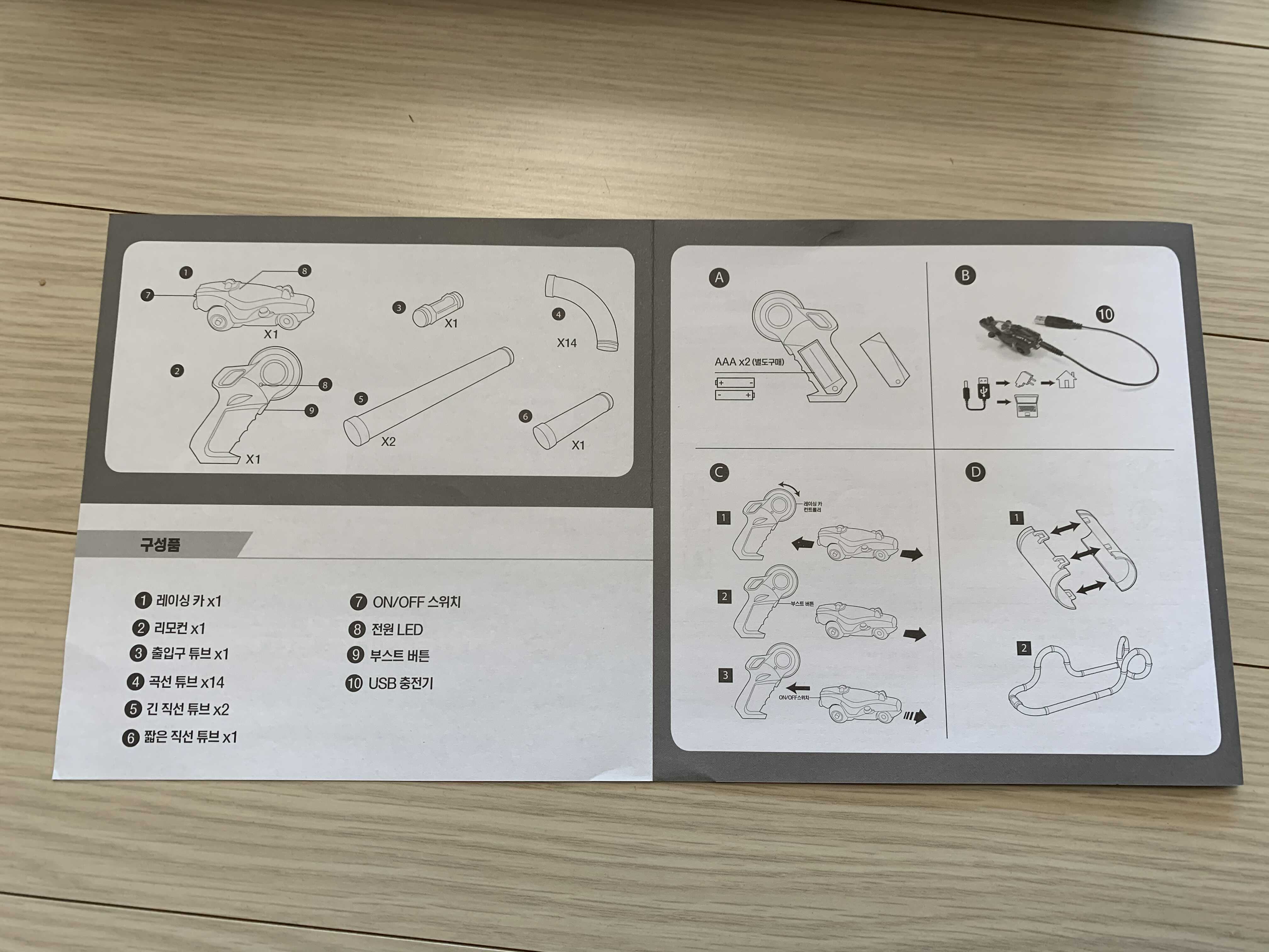 원산지는 역시나 마데인 중국이며, 사용연령은 5세이상 입니다. 박스를 개봉해 보니 구성품은 노란색 곡선 튜브와 회색의 직선 튜브 및 출입구 튜브 등이 들어 있습니다. 또한 리모컨 하나와 차량 1대 및 충전 케이블이 들어 있고요.