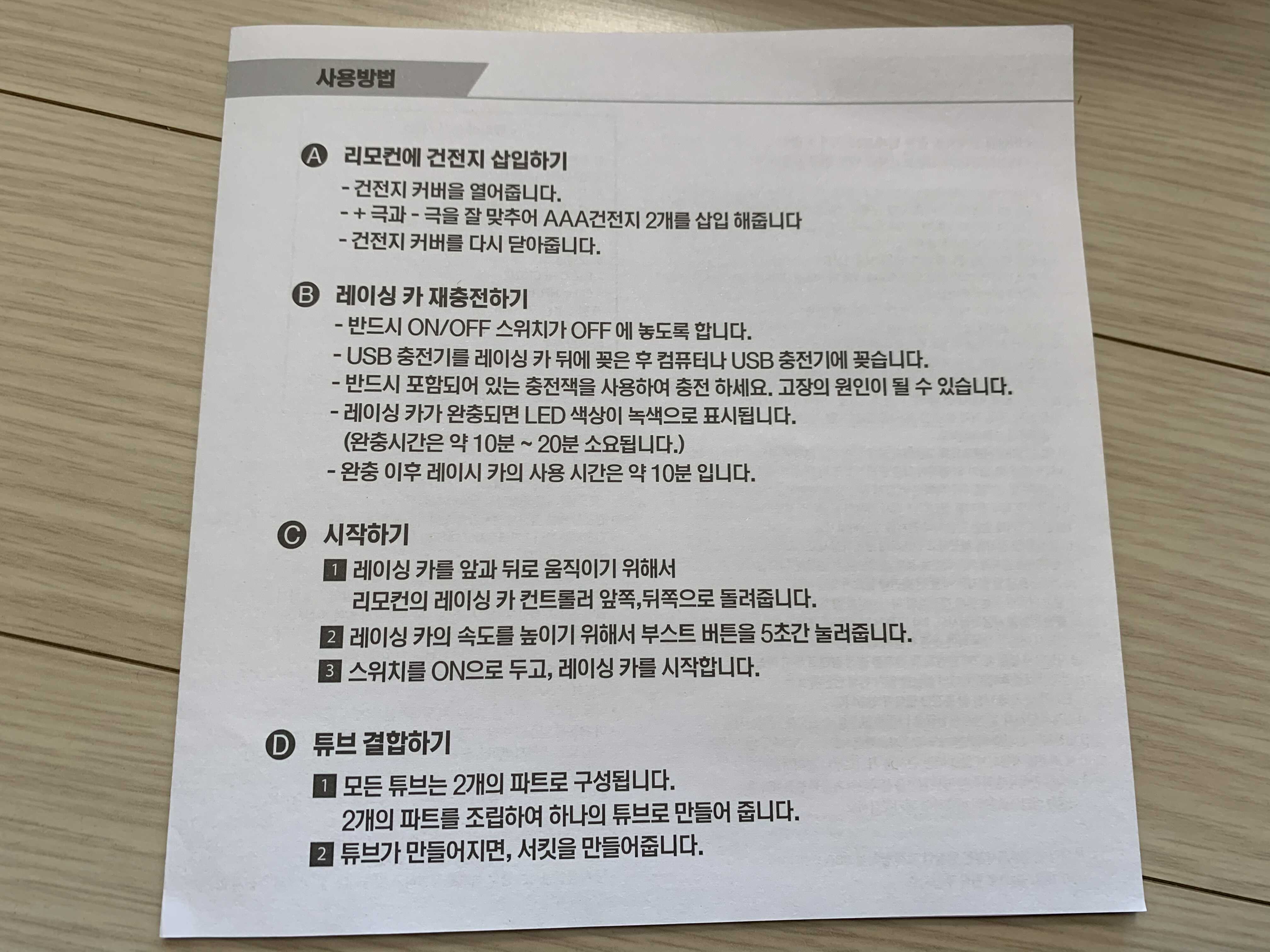 창의력을 발휘해서 본인이 원하는 서킷 트랙모양을 만들어주면 레이싱 준비 끝입니다. 레이싱카의 전원을 ON으로 켜면 파란색 불이 들어오고 리모컨을 앞 뒤로 돌리면 차량이 앞으로 또는 뒤로 갑니다. 또한 부스트 버튼은 주행중 5초간 누르고 있으면 터집니다.