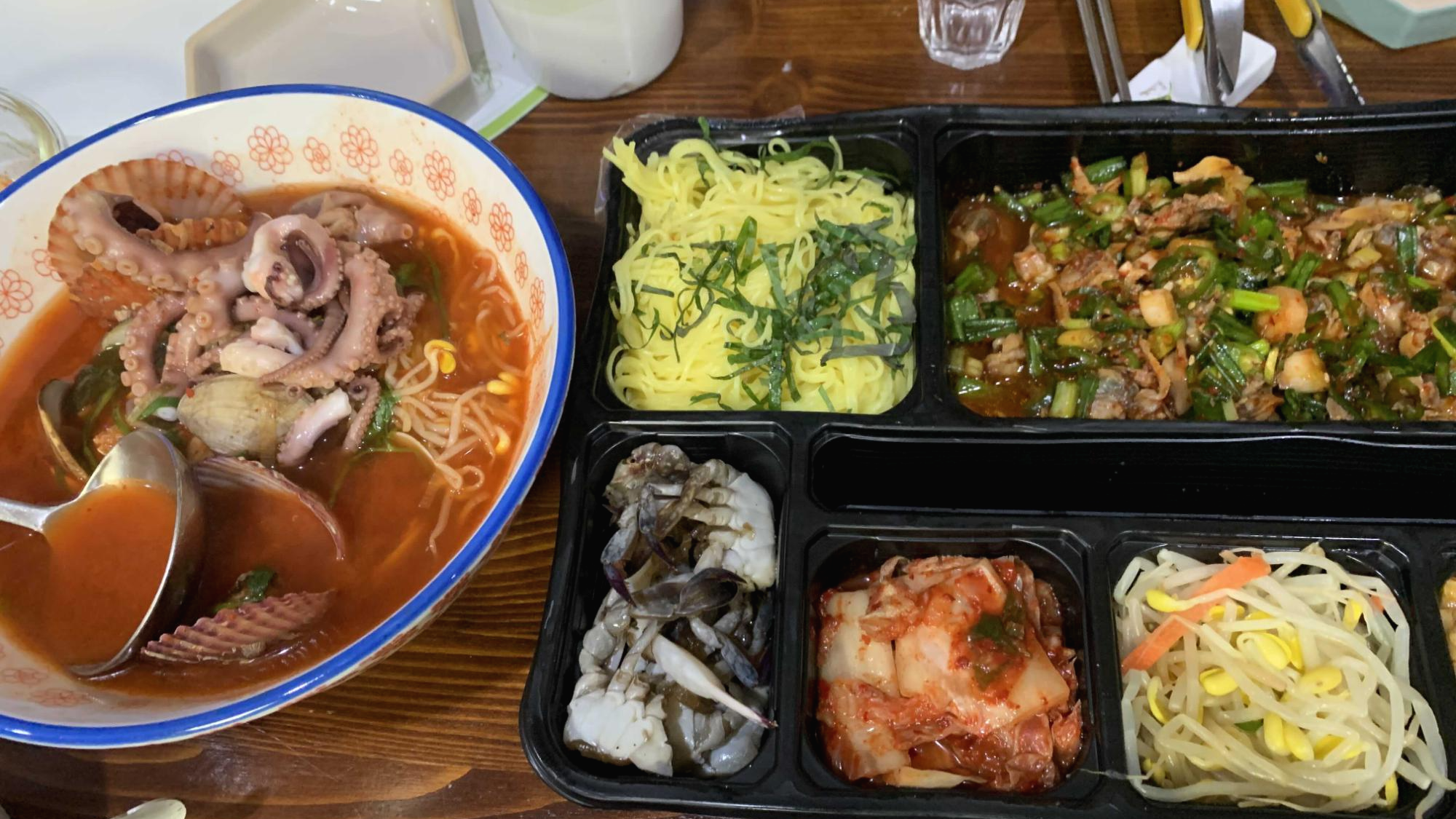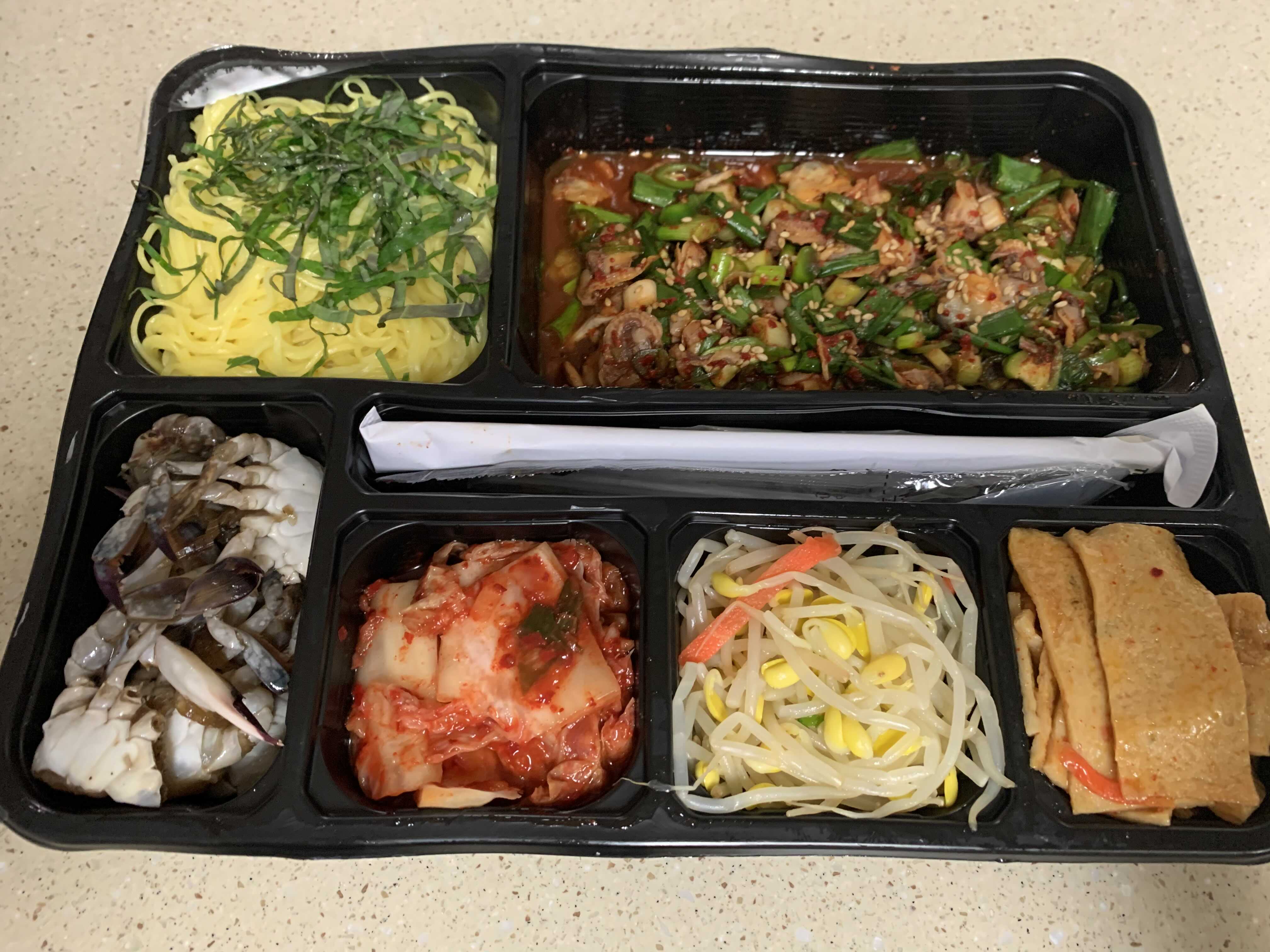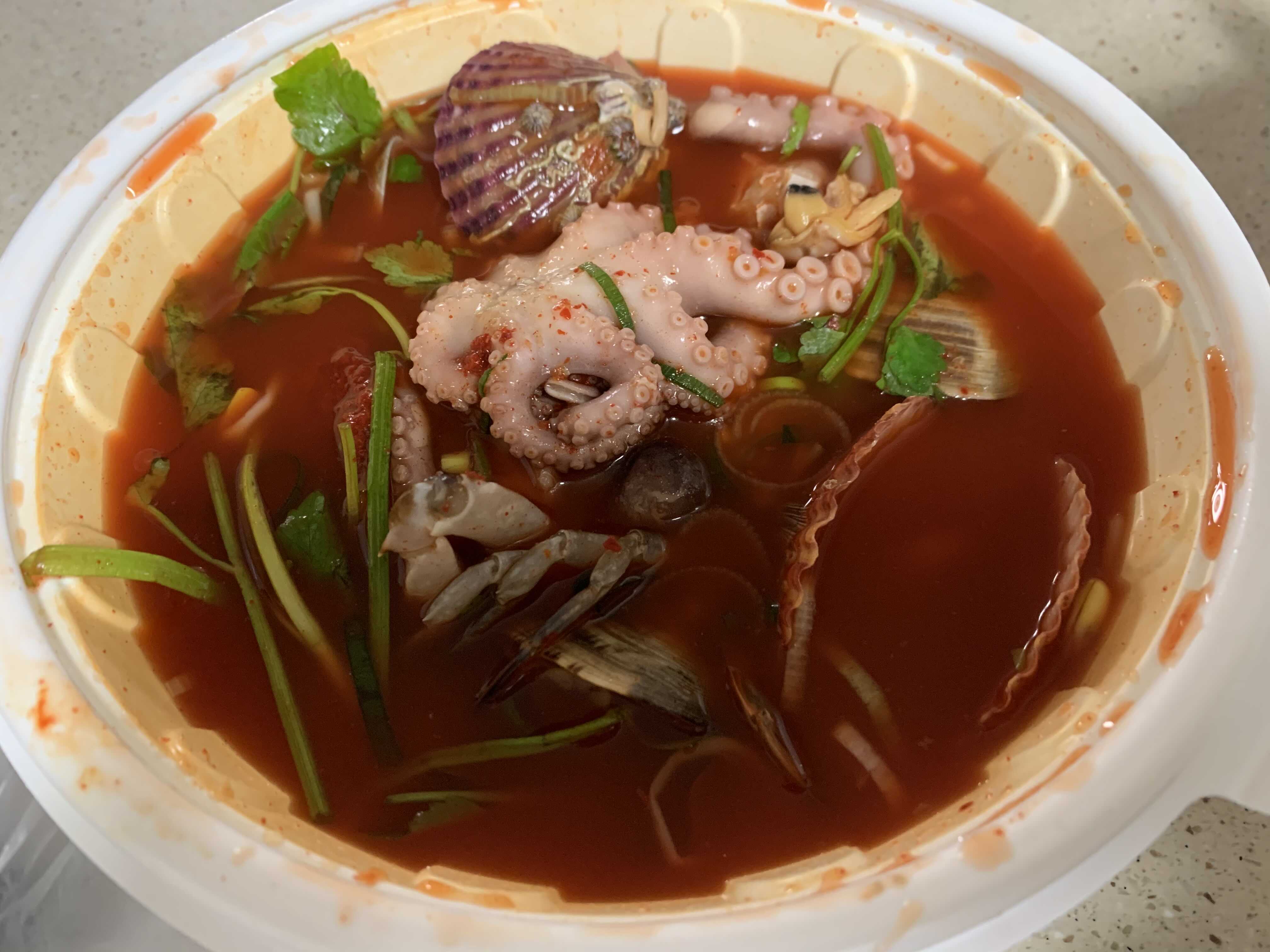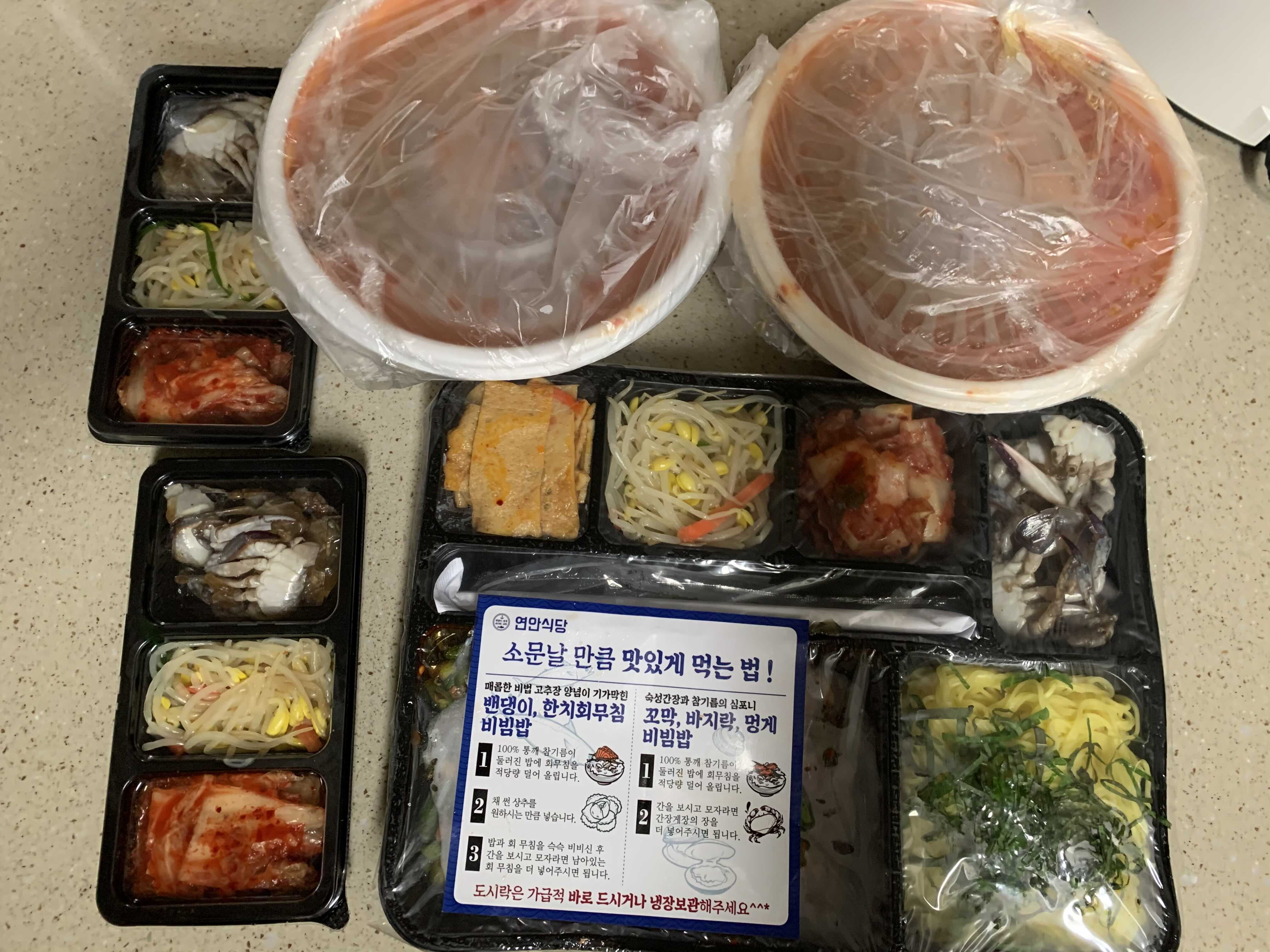 해물탕은 반조리 되서 배달이 되는데 냄비에 옮겨 담아 한번 더 끓여서 드시면 될거 같아요. 국물이 생각보다 얼큰하고 시원하네요. 꼬막비빔밥하고 같이 먹으니 훌륭합니다.