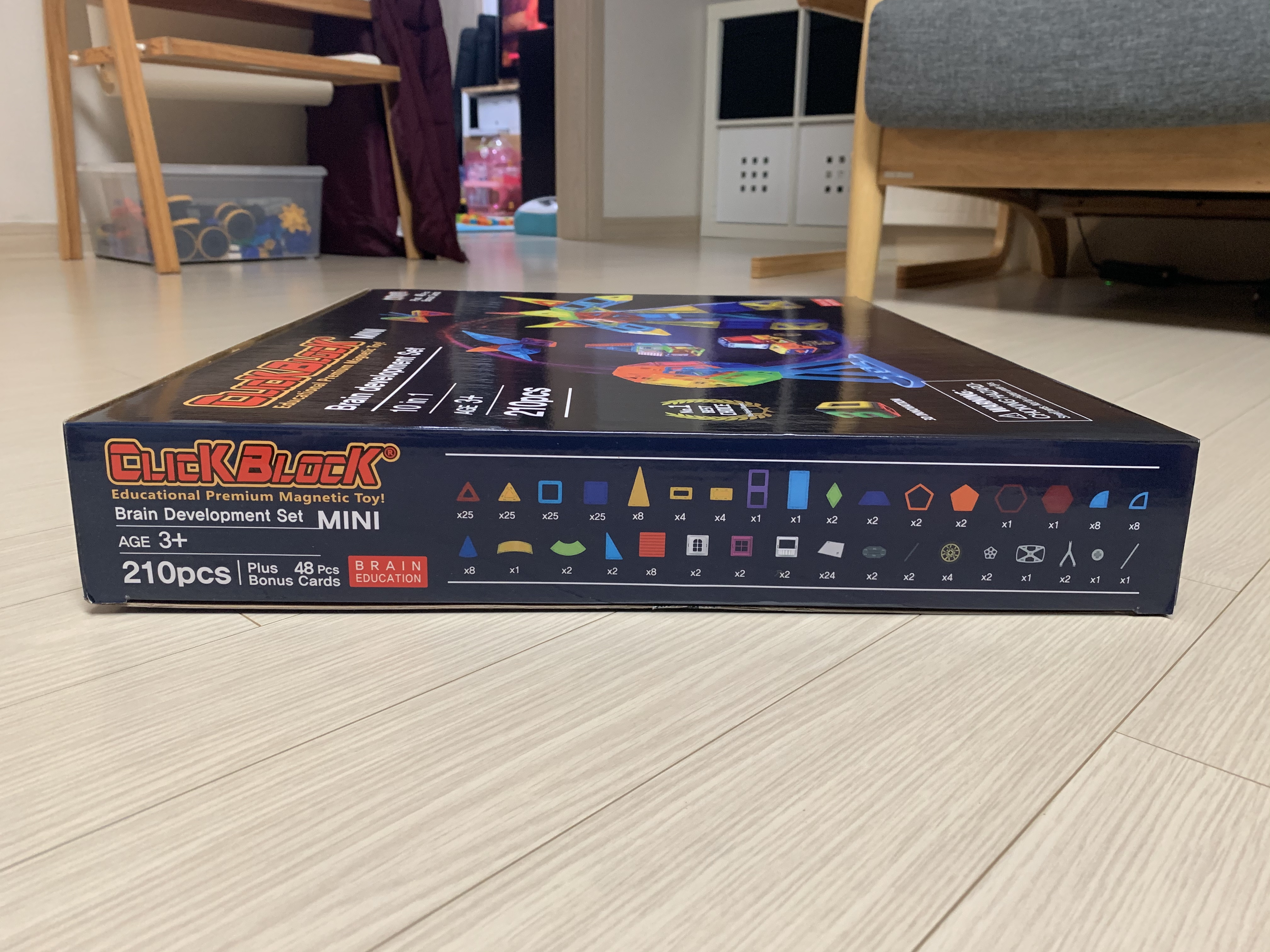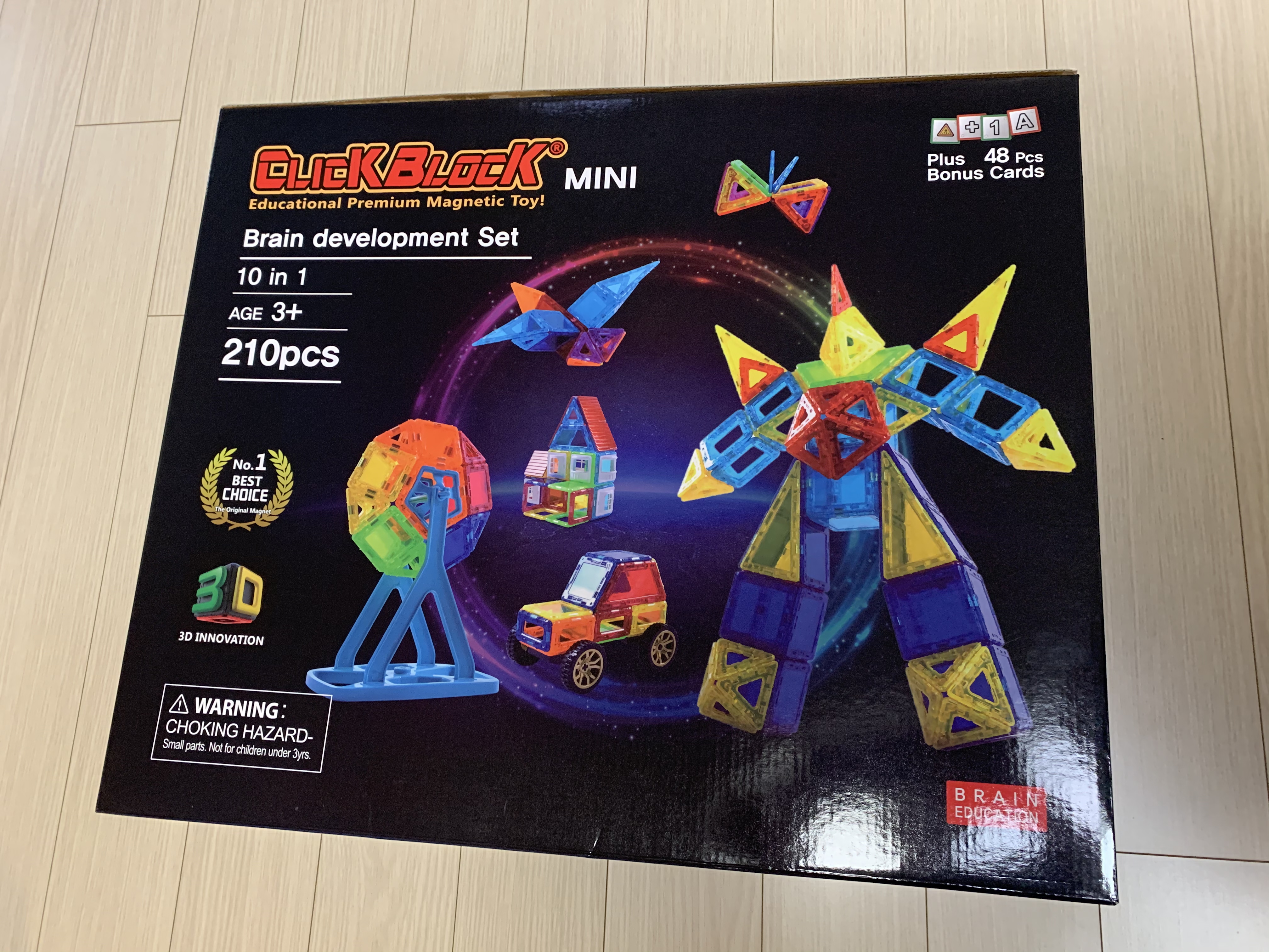 제품명칭은 CLICK BLOCK "Brain development Set" 이며, 210pcs 구성이며 연령은 3세 이상이라고 기재되어 있네요.