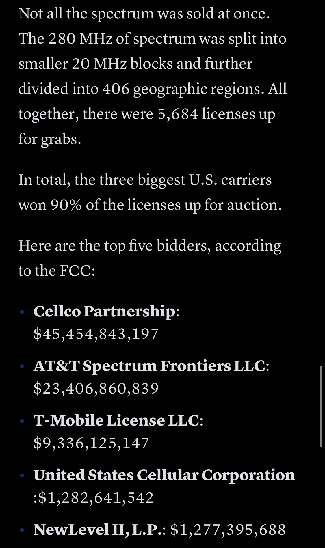 모든 스펙트럼이 한 번에 판매되는 것은 아닙니다. 280MHz의 스펙트럼은 더 작은 20MHz 블록으로 분할되었고 406개의 지리적 영역으로 더 분할되었습니다. 모두 합쳐서 5,684 개의 라이센스가 확보되었습니다.