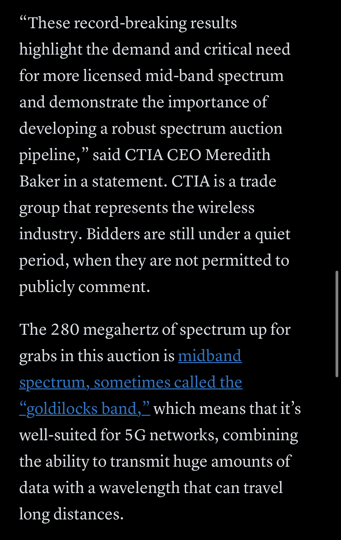“이 기록적인 결과는 더 많은 라이선스를 받은 미드 밴드 스펙트럼에 대한 수요와 중요한 필요성을 강조하고 강력한 스펙트럼 경매 파이프 라인 개발의 중요성을 보여줍니다.”라고 CTIA CEO Meredith Baker는 성명서에서 말했습니다. CTIA는 무선 산업을 대표하는 그룹입니다.