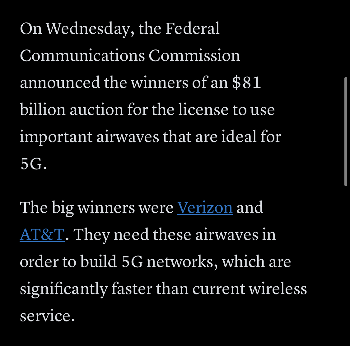 - 가장 큰 승자는 Verizon과 AT&T이며, 현재 무선 서비스보다 훨씬 빠른 5G 네트워크를 구축 가능하게 됨.
