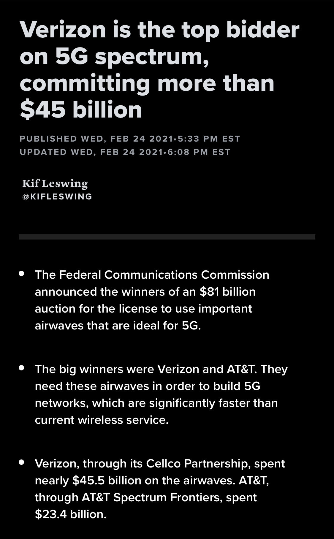 - 연방 통신위원회 (FCC)는 5G 사용 라이선스 810억 달러 경매 승자를 발표.