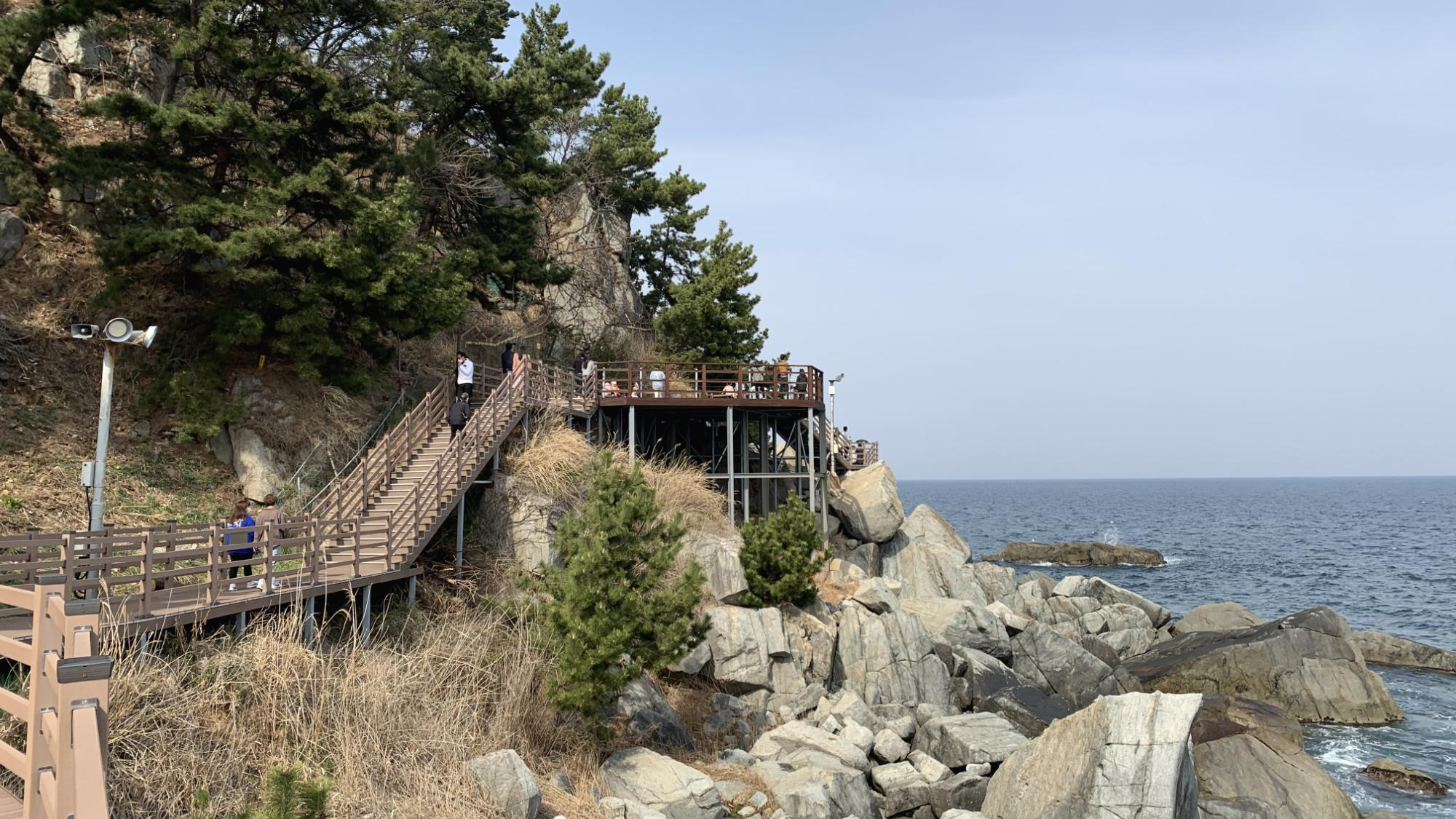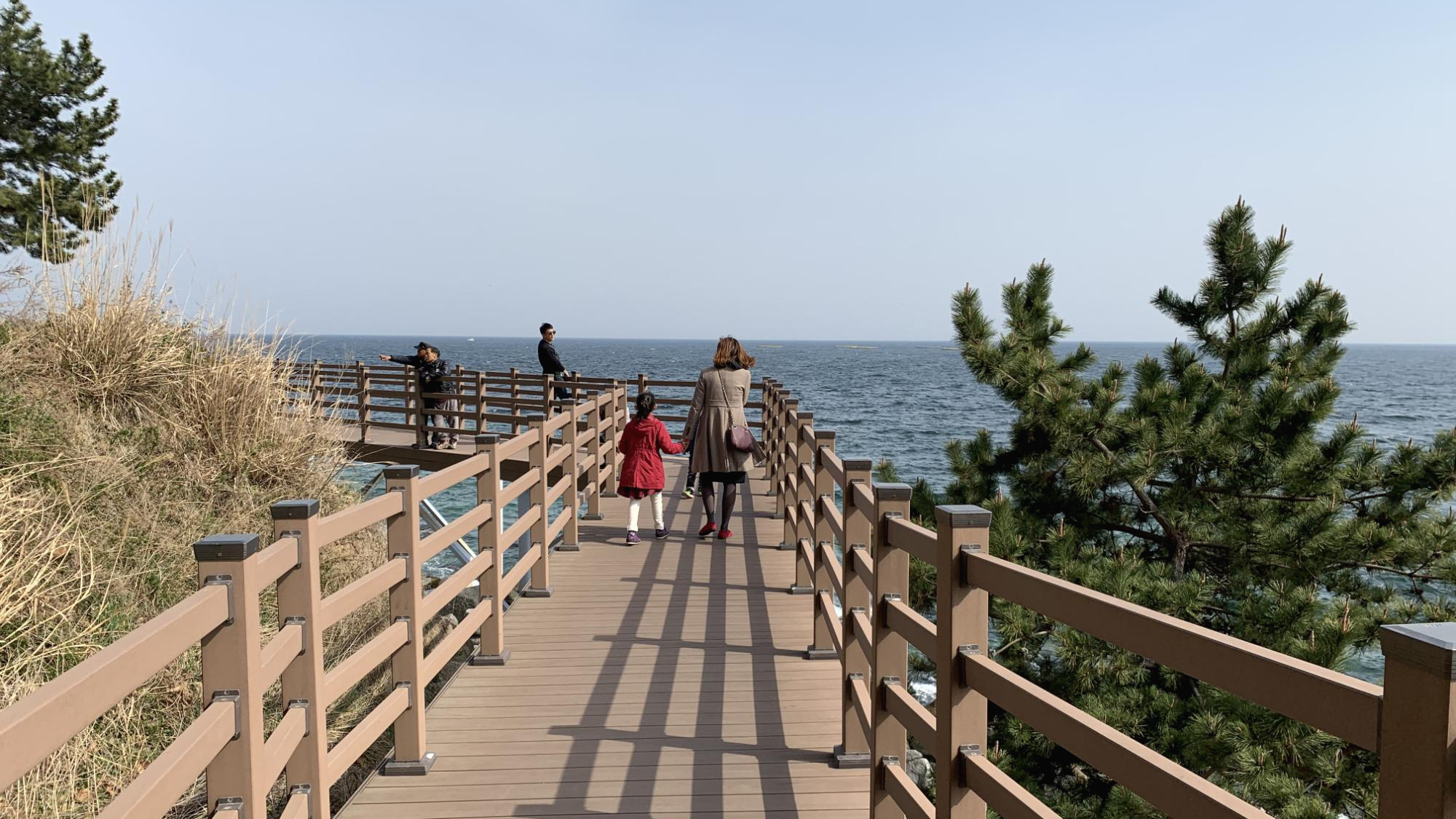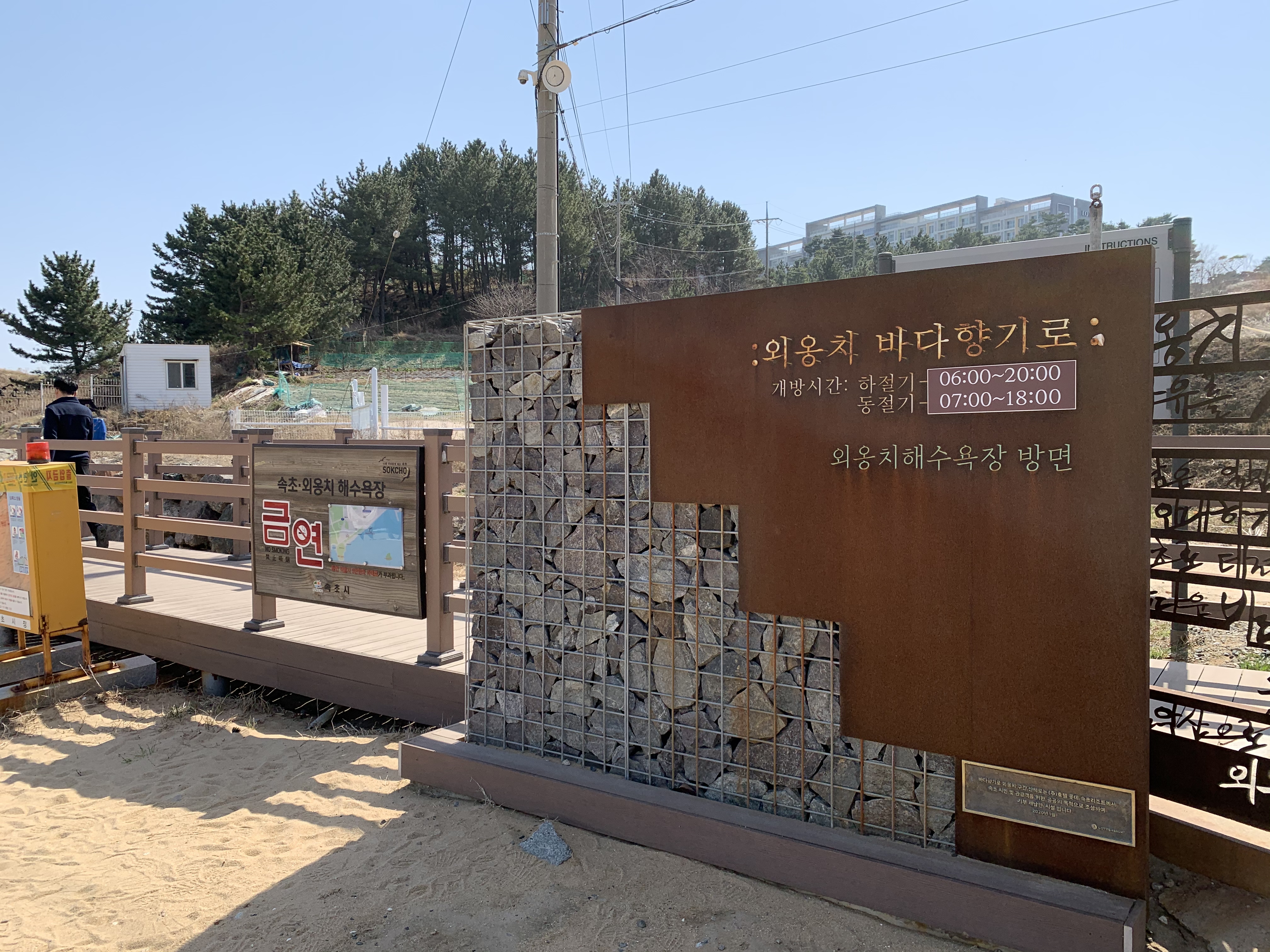 산책길이 해변에 바로 붙어 있어 날씨 파도가 높게 치는 날씨 안좋은 날은 폐쇄되는 거 같아요. 외옹치항에 가면 작은 횟집들이 다닥다닥 붙어 있어 있는데 저렴한 가격에 맛있는 회 한접시 먹고 오는것도 좋겠네요.