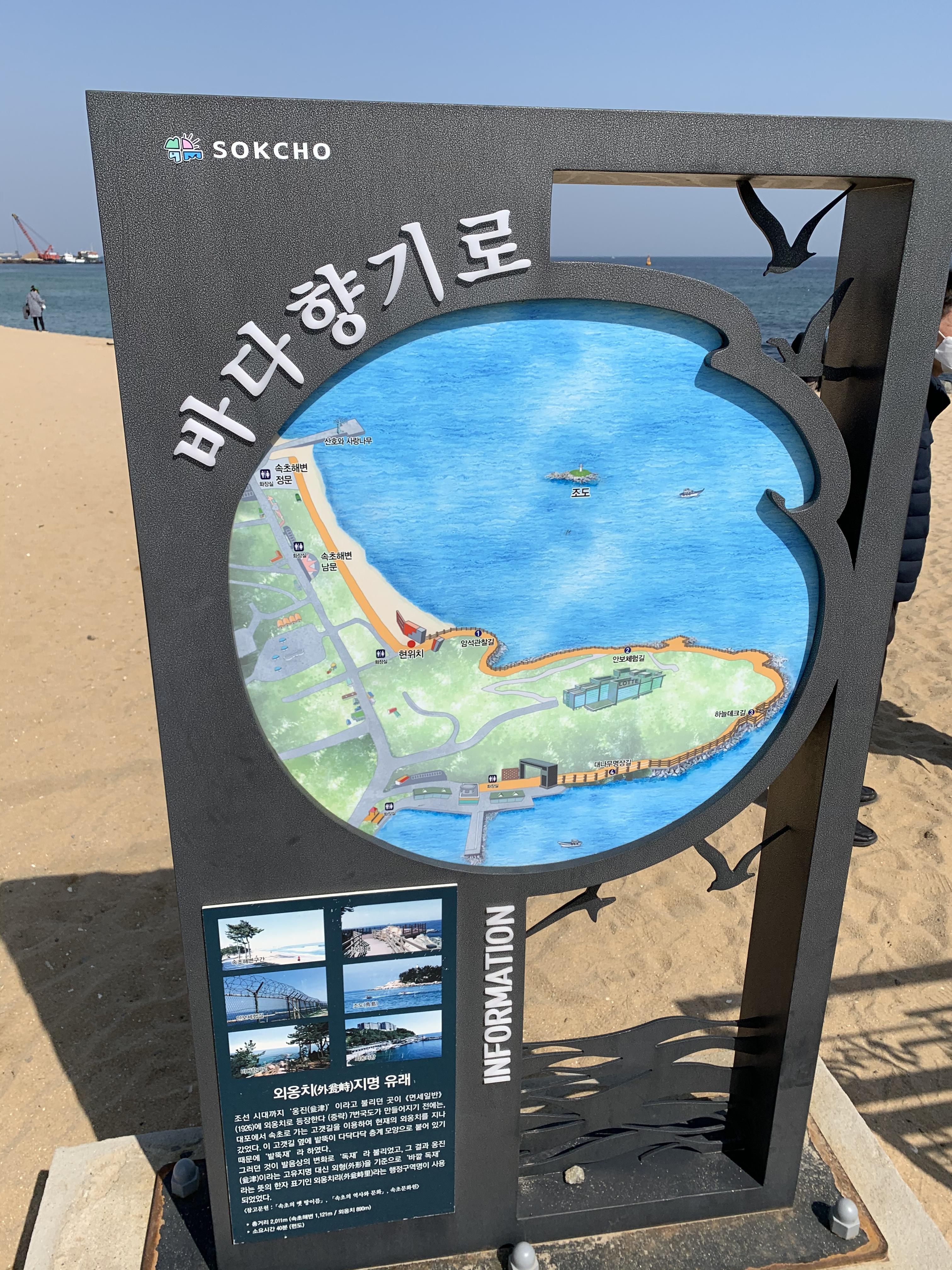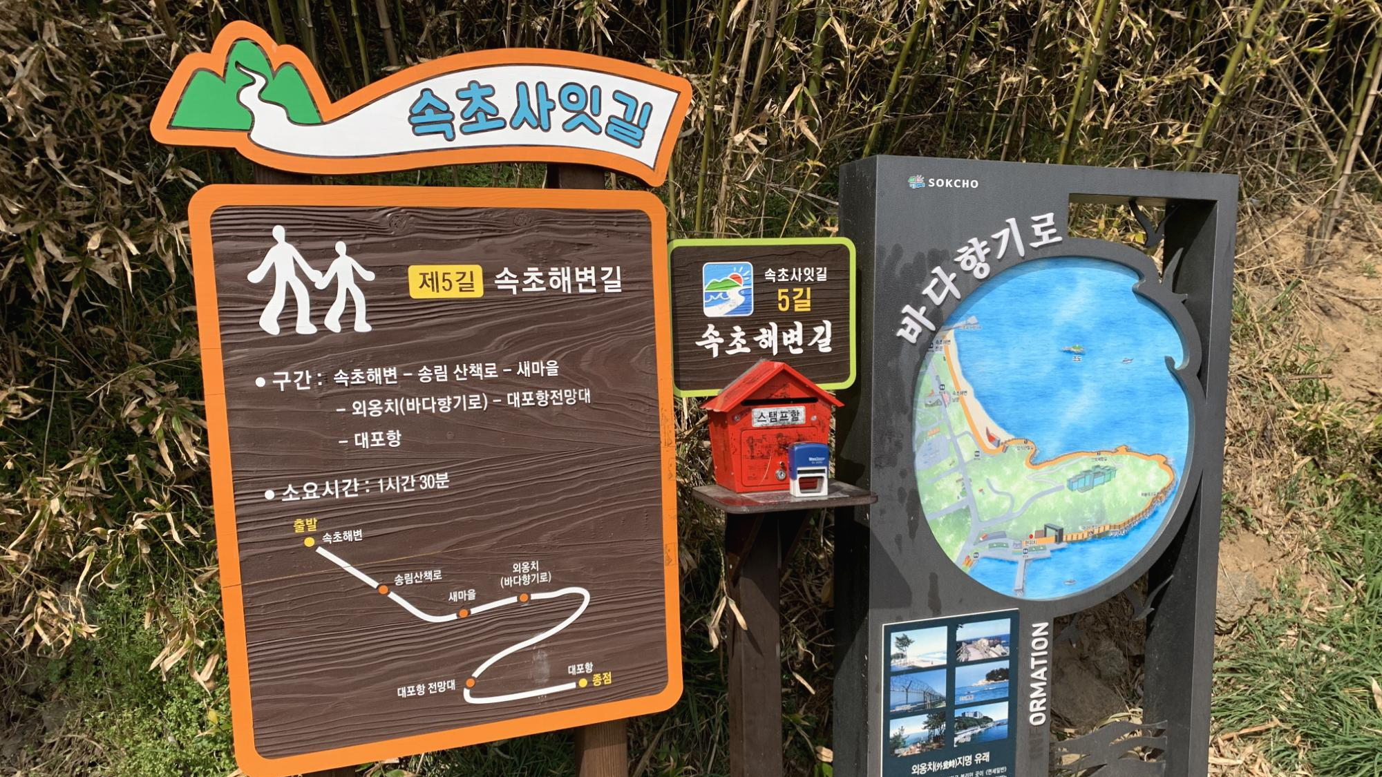 5길에 해당되는 속초해변길 구간은'속초해변 - 송림산책로 - 새마을 - 외옹치(바다향기로) - 대포항전망대 - 대포항' 까지 소요시간 약 1시간 30분거리의 코스에 해당됩니다.